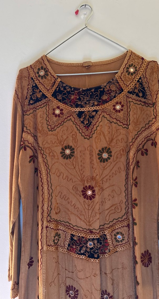 Uzun kollu, bol kesim henna elbise, koyu kahverengi kumaş üzerinde boncuklu ve nakışlı detaylara sahiptir. V yaka ve bohem tarzındadır, günlük kullanıma uygundur.