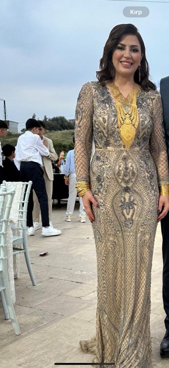 Uzun, v yaka ve boncuk detaylı bu dar kesim altın yılan desenli elbise, düğünler için uygundur. Uzun kollu ve gösterişli bohem tarzındadır. ✨