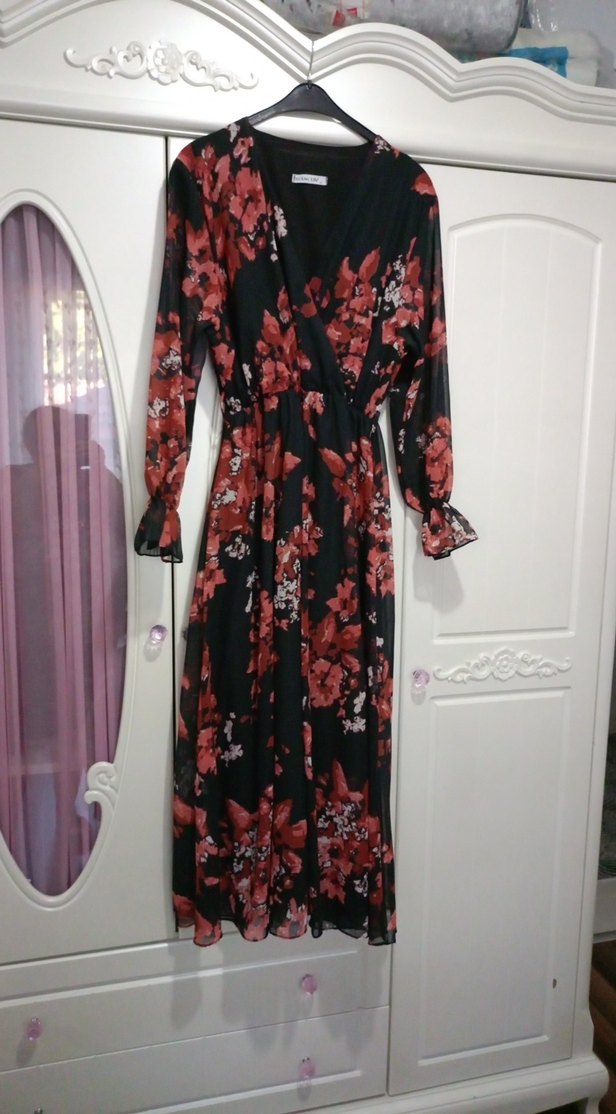 Bordo renkte, uzun kollu, V yaka ve salaş kesimli, drapeli çiçek desenli uzun elbise. Bohem tarzı için uygundur.
