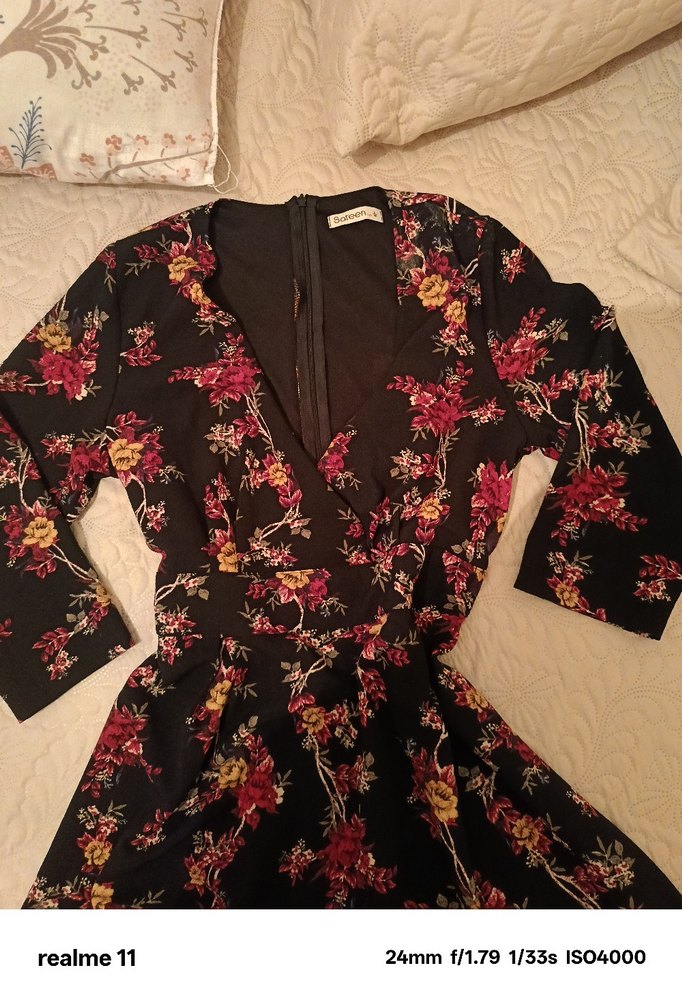 Bordo renkli, çiçek desenli, uzun kollu ve düğmeli bu bohem kimono bol kesim ve V yakaya sahip. Sentetik kumaştan üretilmiştir, romantik akşamlar için uygundur.