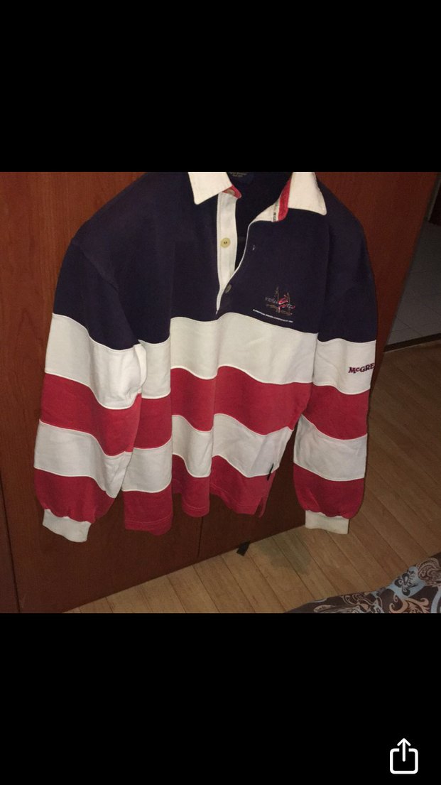 Uzun kollu, düğmeli yakalı erkek sweatshirtü. Bordo, beyaz ve lacivert çizgili, rahat ve sıcak kumaştan, sokak tarzına uygun. Yurt dışı ürünü