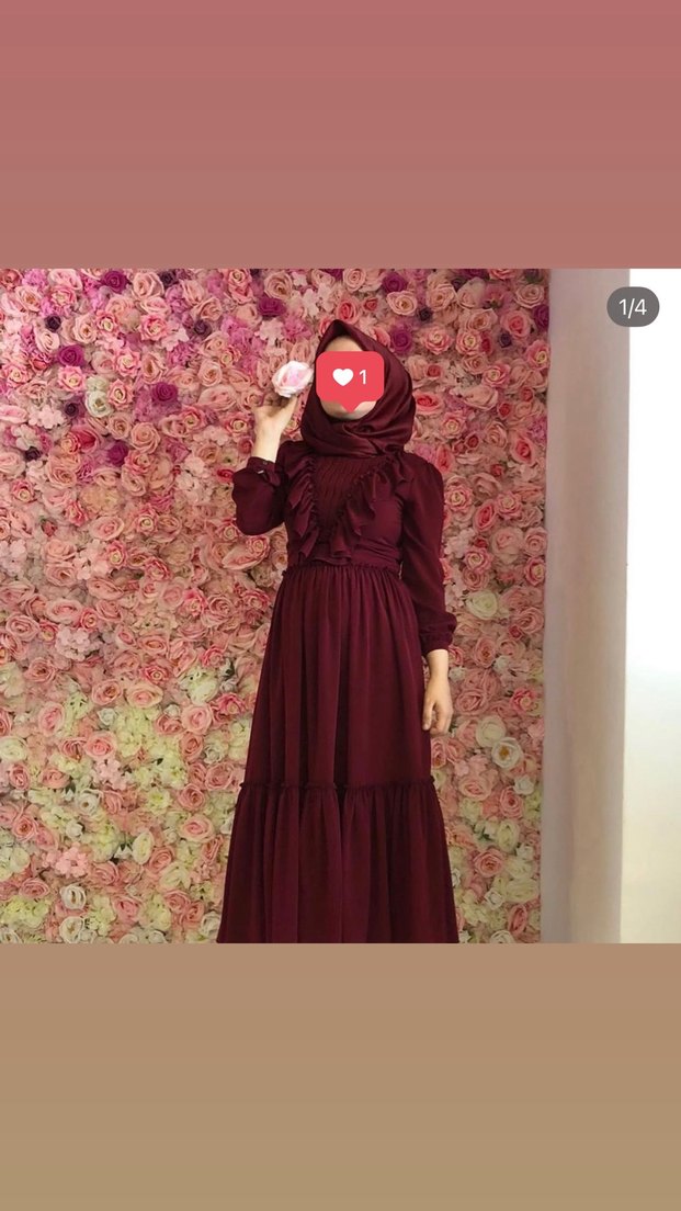 Yüksek yakalı, uzun kollu ve bol kesim bordo renkli uzun elbise. Fırfır detaylı, baskılı bohem tarzda, düğünler için uygun.