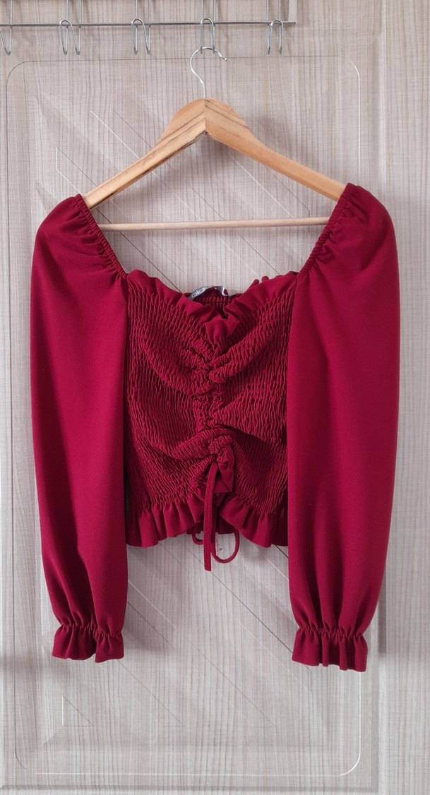 Bordo renkli, tek renk uzun kollu, fırfırlı kısa kesim kadın bluz. V yaka ve bileklerde fırfır detayı bulunur, rahat sentetik kumaştan üretilmiştir.