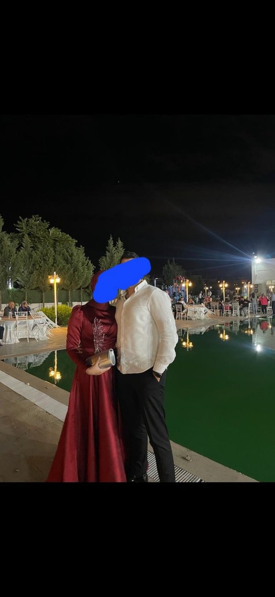 Uzun kollu, yüksek yakalı ve drapeli detaylı bordo abiye elbise. Ön kısmında zarif işlemeler bulunur. Düğün ve özel davetler için uygundur. 170 boy 65 kg ile giyilmistir.