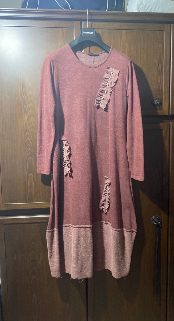 Uzun kollu, bordo renkte, bol kesim triko elbise. Yakada ve etek kısmında fırfır detayları bulunan bohem tarzda rahat bir model.