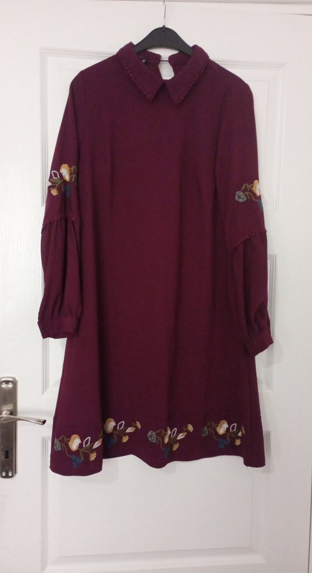 Bordo renkli uzun kollu, yüksek yakalı, bol kesim bohem tuniğin üzerinde nakışlı çiçek desenleri bulunur. Düğmeli manşetleri vardır, romantik akşamlar için uygundur.