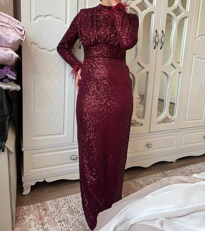 Bordo renkli, uzun kollu ve yüksek yakalı, parlak desenli kumaştan yapılmış, drapeli ve vücuda oturan abiye elbise. Romantik akşamlar için uygun.