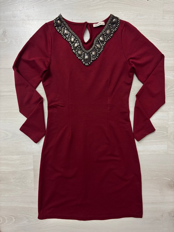 Uzun Kollu Bordo taşlı elbise
