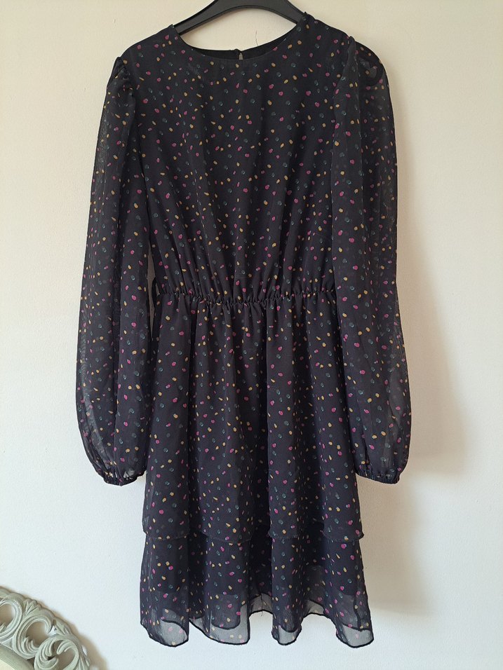 Uzun kollu, fırfır detaylı, beli lastikli ve yuvarlak yakaya sahiptir. Kollar tül, etek çift kat fırfır, etek içi astarlı #elbise #ofiselbise