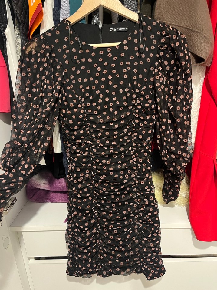 36 beden zara elbise 2 defa giyildi iyi durumda . Siyah kumaş ve tül üzerine pembe çiçek baskıları olan uzun kollu bir elbisedir.