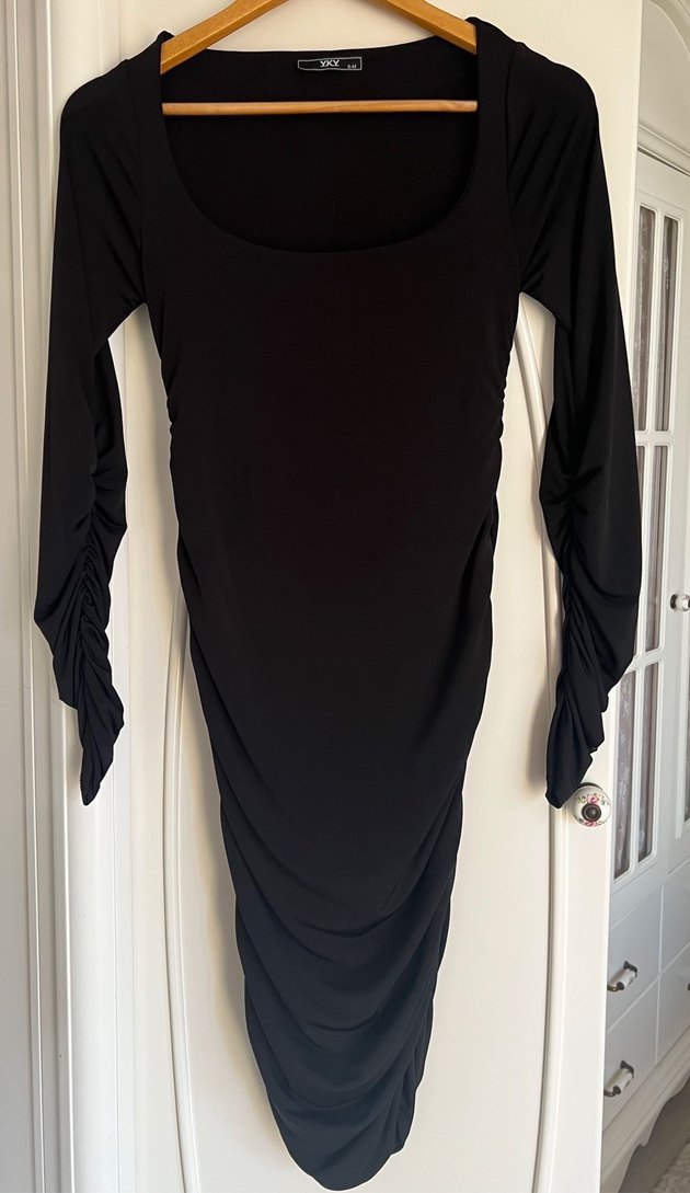 Bu siyah abiye elbise, uzun kollu ve v yakalı, drapeli detaylarıyla fit kesimdir. Gotik tarzda, romantik akşamlar için uygundur. Desensiz ve şık bir modeldir. Yanları ve kolları büzgülüdür S/M