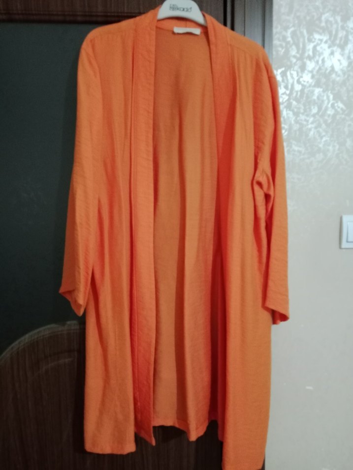 Uzun kollu, salaş kesim kadın sabahlık turuncu parlak renkte, desensiz ve minimalist normcore tarzında.