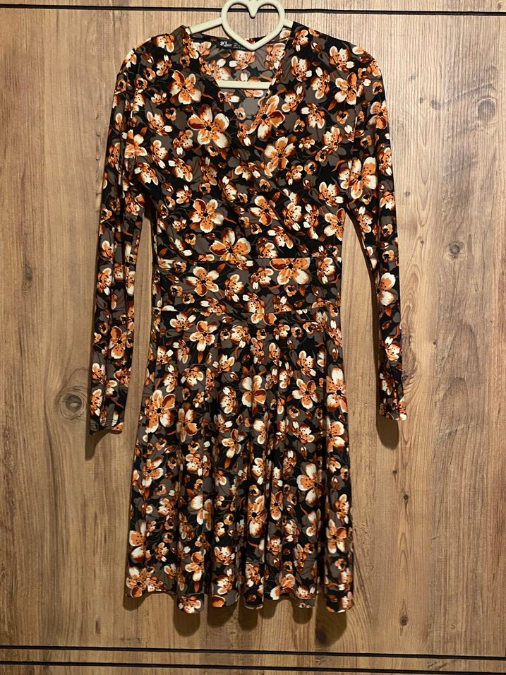 Uzun kollu, bol kesim bohem elbise; V yaka ve pileli etek detayına sahip. Yumuşak sentetik kumaş üzerinde koyu kahverengi çiçek desenli. Belden oturan yapısı var