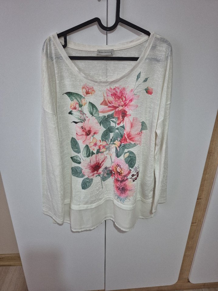Pamuklu, uzun kollu, bol kesim beyaz bluz, pastel çiçek desenli ve örme dokusuyla günlük kullanıma uygun.