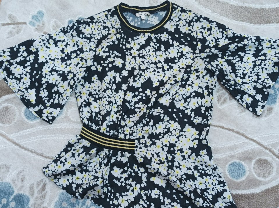 Uzun kollu, yuvarlak yaka, çiçek desenli ve fırfırlı kadın bluzudur. Sentetik kumaştan, Paris sokak modası tarzında gri ve sarı renklerde.