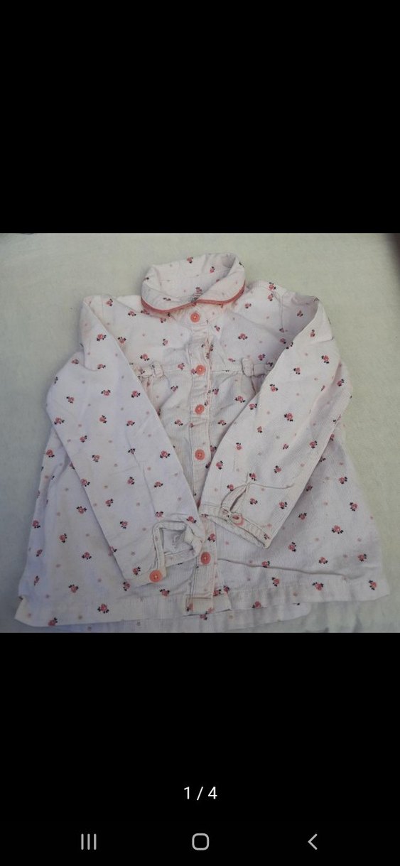 Keten, uzun kollu, yakalı ve düğmeli, bol kesim kız bebek gömleği. Pastel beyaz üzerine küçük çiçek desenli. 24-36 ay uyumlu
