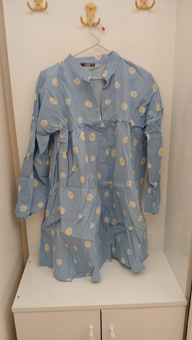 Uzun kollu, yakalı ve düğmeli, mavi renkli küçük beyaz çiçek desenli bol kesim .