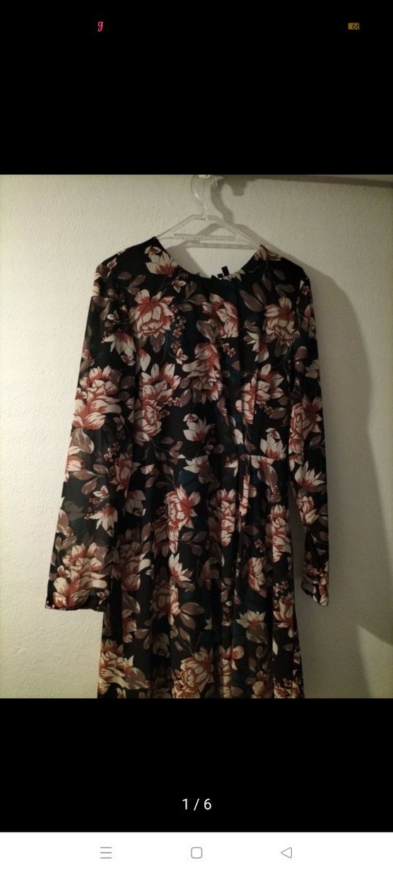 Uzun, bol kesim elbise, çiçek desenli ve uzun kolludur. Yumuşak sentetik kumaştan yapılmıştır, V yakalı ve drapeli bohem tarzındadır.