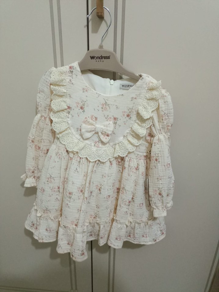 Pamuk kumaştan yapılmış, uzun kollu, bol kesim beyaz elbise. Pastel çiçek desenleri, yuvarlak yaka ve fırfır detayları vardır. Marka: Wondres.