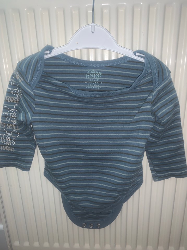 Uzun kollu, bisiklet yaka ve düğmeli bebek body. Mavi ve gri çizgili desene sahip, kolunda hafif yazı detayları bulunan yumuşak denim görünümlü kumaştan yapılmıştır.
