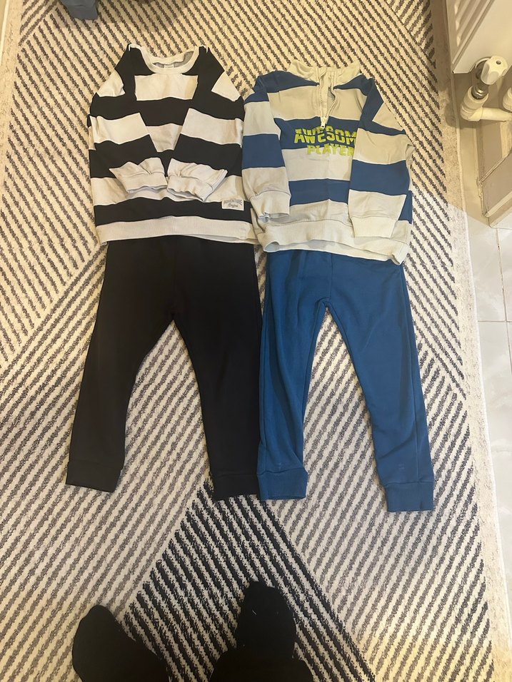 Uzun kollu, yüksek yakalı çizgili üstler ve düz renk pantolonlardan oluşan bebek erkek takımı. Örgü yumuşak ve sıcak kumaş rahatlık sağlar. Koyu mavi ve siyah tonları mevcuttur.