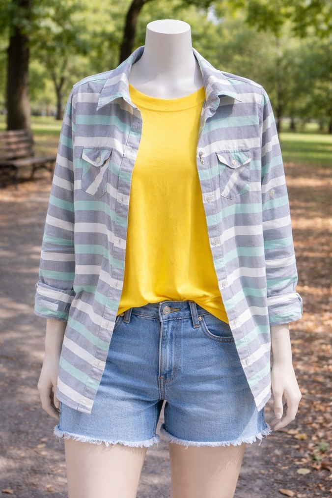 Uzun kollu, yakalı ve düğmeli, pastel çizgili desenli bol kesim denim gömlek. Günlük sokak stili için uygun.