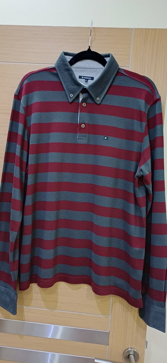 Uzun kollu, düğmeli yakalı erkek polo tişört. Bordo ve gri çizgili, bol kesim, günlük rahat stil için uygundur.