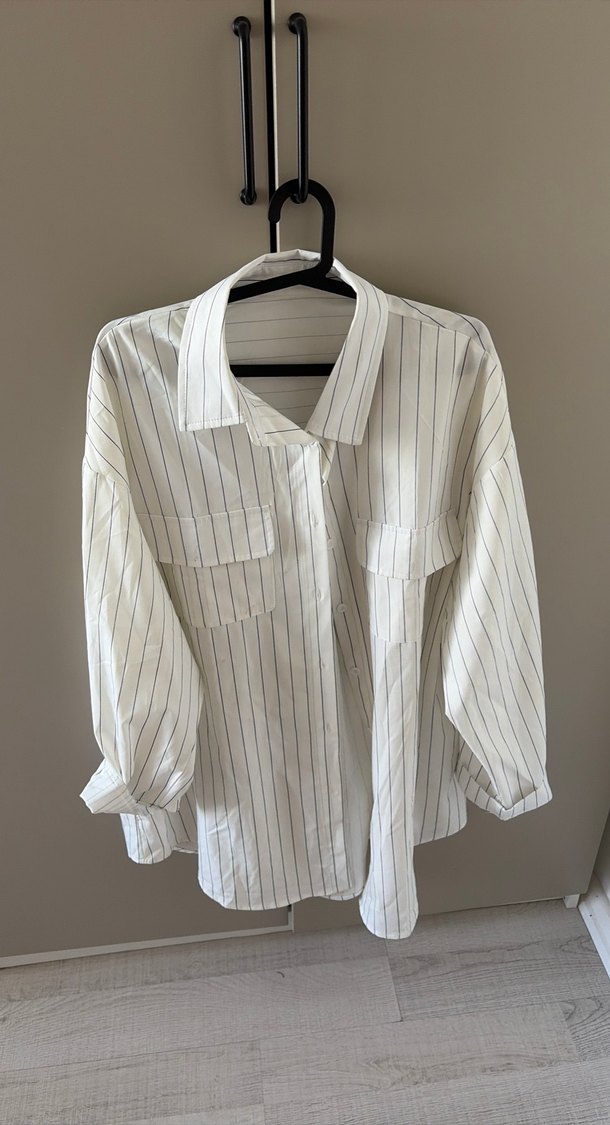 Gri çizgili beyaz keten gömlek, uzun kollu ve yakalıdır. Düğmeli ve cep detaylı, rahat kesim günlük kullanım için uygundur.