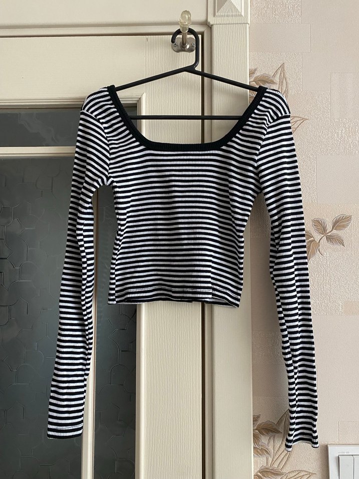 Pamuk kumaştan, uzun kollu ve tekne yaka, çizgili desenli, pilili, minimal sokak stili kadın crop top.