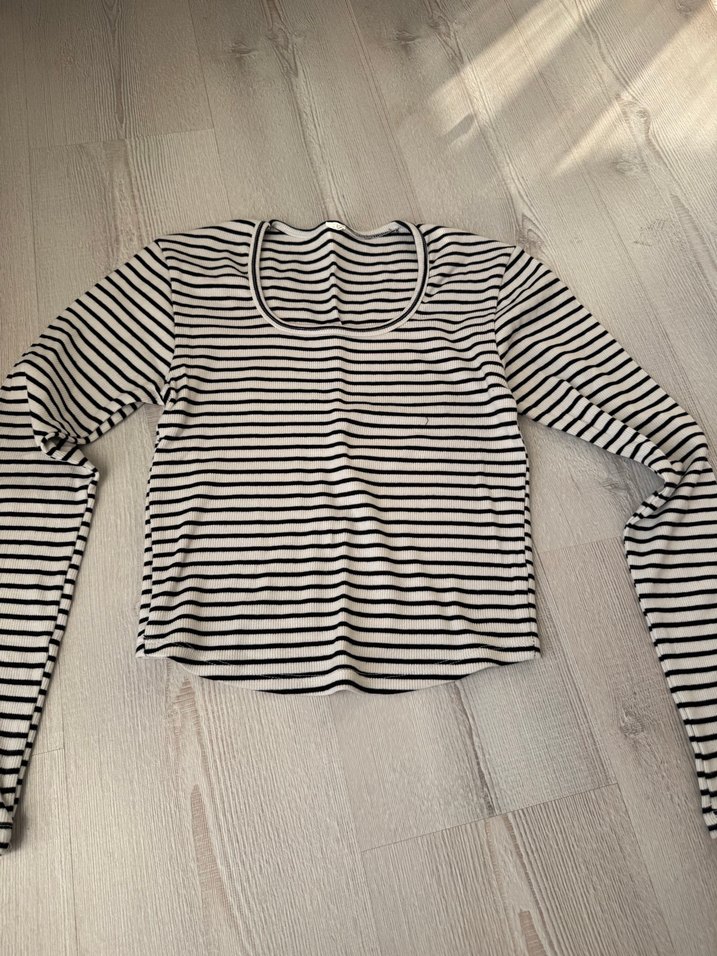 Pamuklu, uzun kollu ve tekne yaka kadın crop top. Gri ve beyaz çizgili deseniyle günlük sokak stiline uygun.