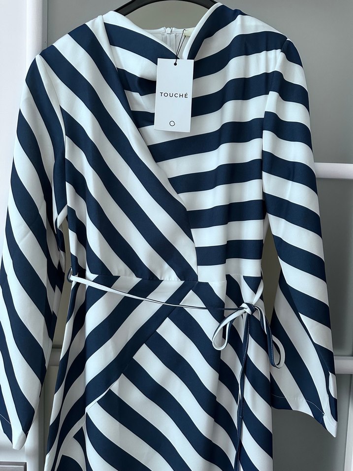 Uzun kollu, bol kesim, gri ve beyaz çizgili kadın elbisesi. Strappy kemer detayı ve normcore Paris tarzı içerir. Marka etiketi "TOUCHÉ" yazılı.
