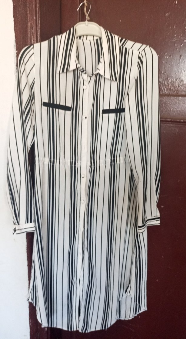 Uzun kollu, yakalı ve regular fit kadın gömlek elbisesi. Beyaz ve gri tonlarda çizgili, pilili detaylara sahip yumuşak sentetik kumaştan yapılmıştır.