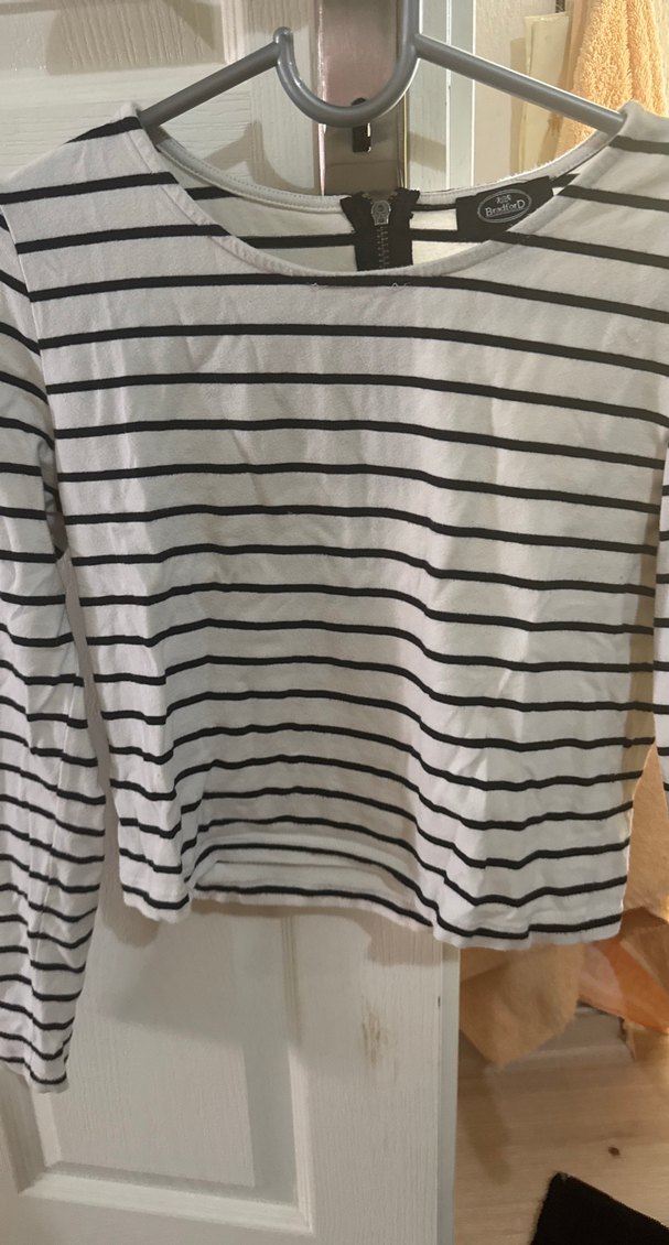 Uzun kollu, tekne yaka ve düğmeli detaylı, beyaz ve gri çizgili kadın tişörtü. Midi boyda, sentetik dokulu kumaştan, günlük rahat sokak stili için uygundur. Croptur deformesi yok