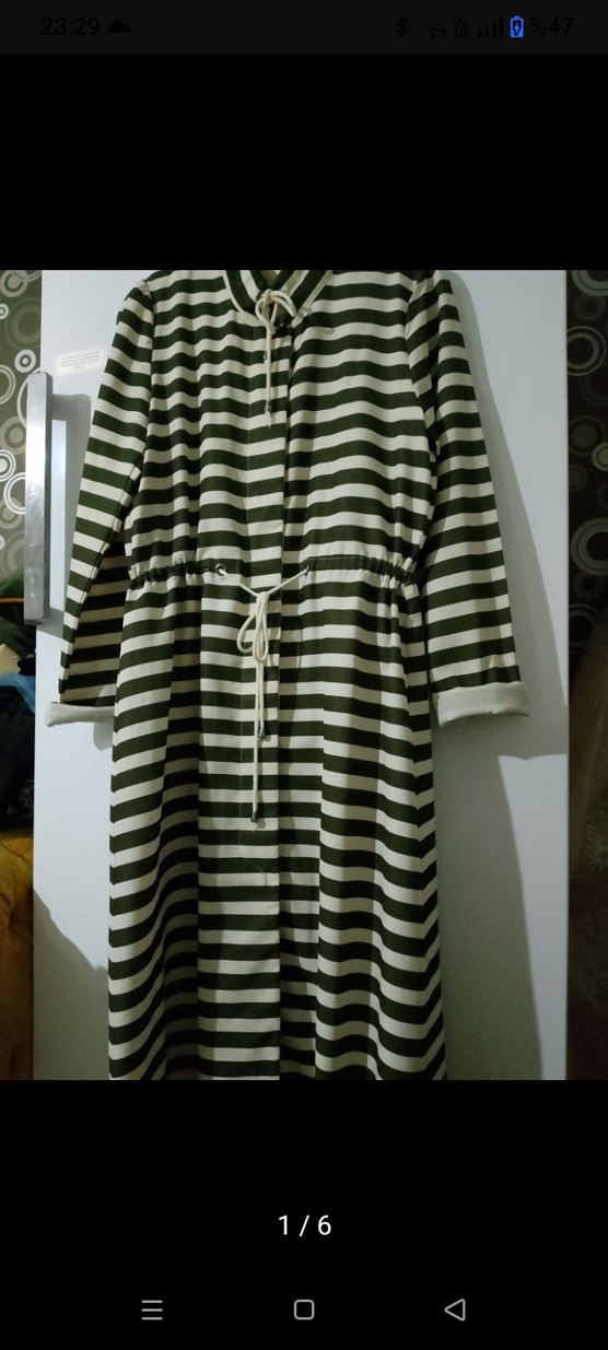 Uzun kollu, bol kesim kadın elbisesi. Yeşil ve gri çizgili desene sahip, belden ayarlanabilir ip detaylı, günlük rahat stil.