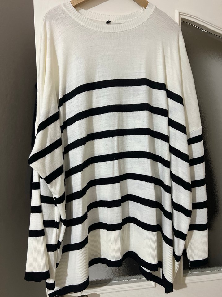 Siyah çizgili beyaz, uzun kollu, gevşek kesim, kayık yaka örme triko. Pamuklu, günlük kullanıma uygun, 3 kere giyildi temizdir tesettüre uygundur boyu uzun güncel fiyatı 500Tl’dir.