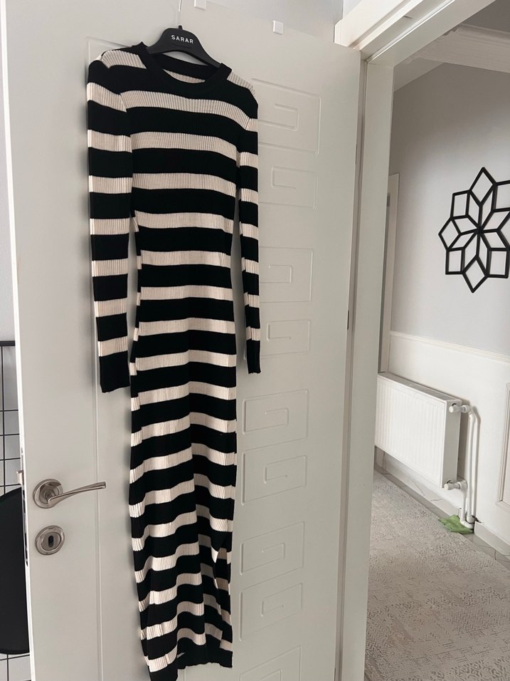 Uzun kollu, siyah-beyaz çizgili, vücuda oturan triko elbise, yumuşak sentetik kumaştan üretilmiştir. Günlük kullanım için uygundur.