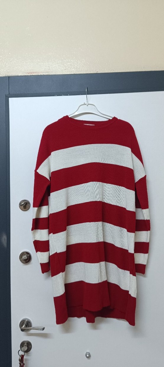 Uzun kollu, yuvarlak yakalı ve bol kesim kadın triko kazak. Kırmızı ve beyaz çizgili, rahat ve günlük kullanıma uygun uzun boy.