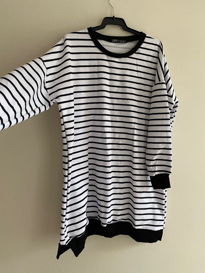 Pamuk kumaştan, uzun kollu, kayık yaka ve bol kesim çizgili kadın tunik. Beyaz ve gri renklerde, günlük rahat şıklık için uygun.