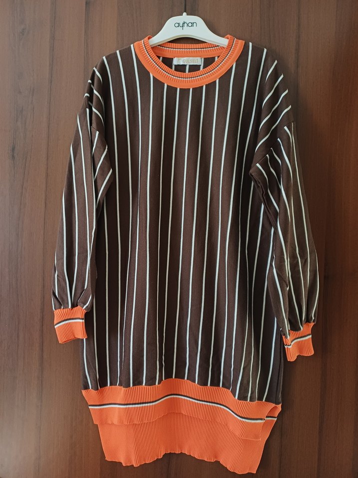 Uzun kollu, kahverengi uzun kazak, dikey çizgiler ve pile detaylarına sahiptir. Turuncu ribanalı yakası, manşetleri ve eteğiyle rahat sokak stiline uygundur. Standart bedendir, 1 kez yıkandı yeni ayarındadır, ölçüler görsellerde mevcuttur