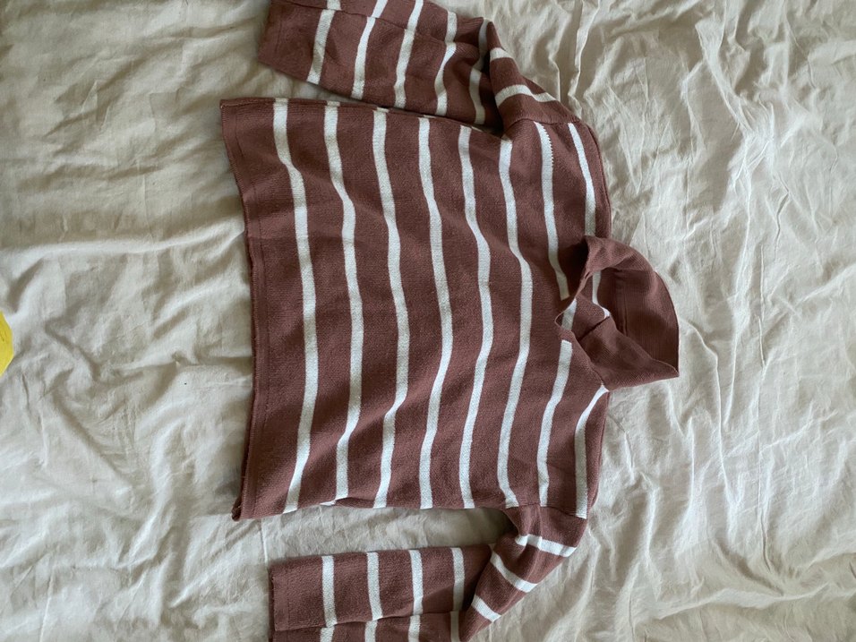 Yumuşak keten kumaştan, çizgili, bol kesim, uzun kollu ve kayık yaka kahverengi örgü kadın triko.
