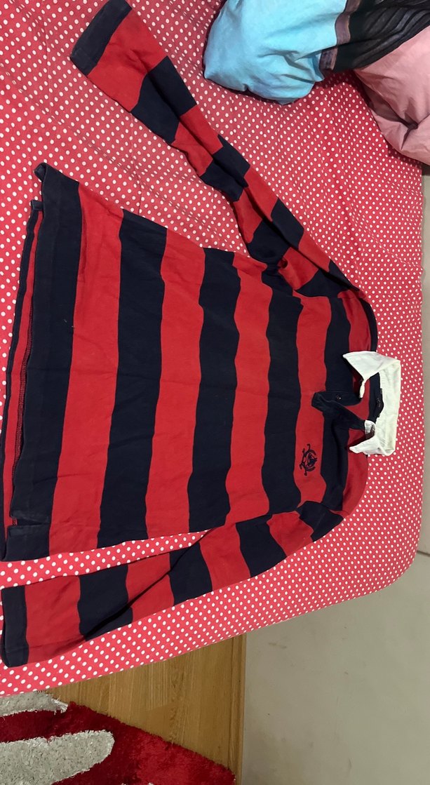 Erkekler için uzun kollu, kırmızı ve lacivert çizgili, yakalı ve düğmeli, dar kesim polo tişört. Kısımda sarılık var bilginize