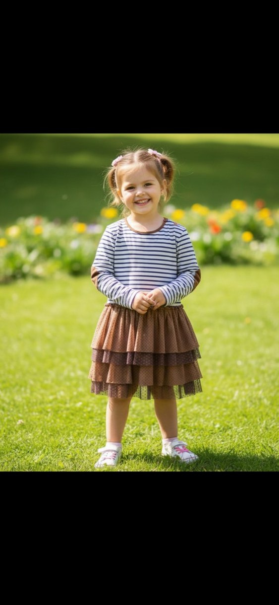 Bu kız elbisesi uzun kollu, yuvarlak yakalı ve bol kesimdir. Üst kısmı çizgili, kahverengi fırfırlı etek kısmı yumuşak sentetik kumaştan yapılmıştır. önünde lekesi mevcut