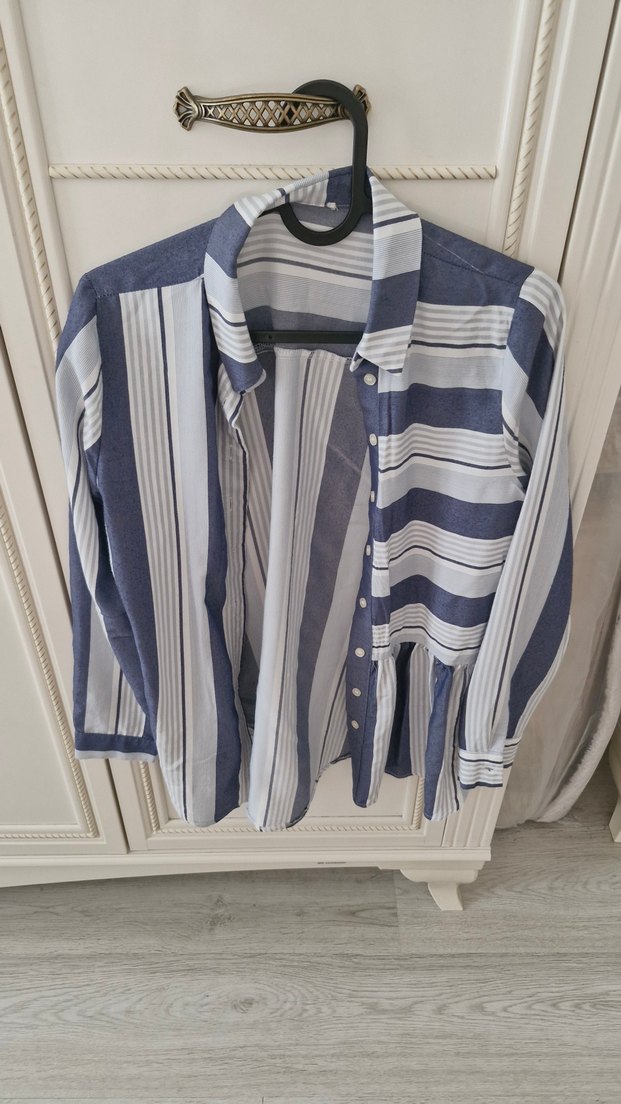 Mavi ve beyaz çizgili, keten kumaştan, uzun kollu, düğmeli ve yakalı, salaş kesim kadın gömleği. Günlük rahat sokak giyimine uygundur.Bir yerinde ip cekmesi var fiyata yansitildi.