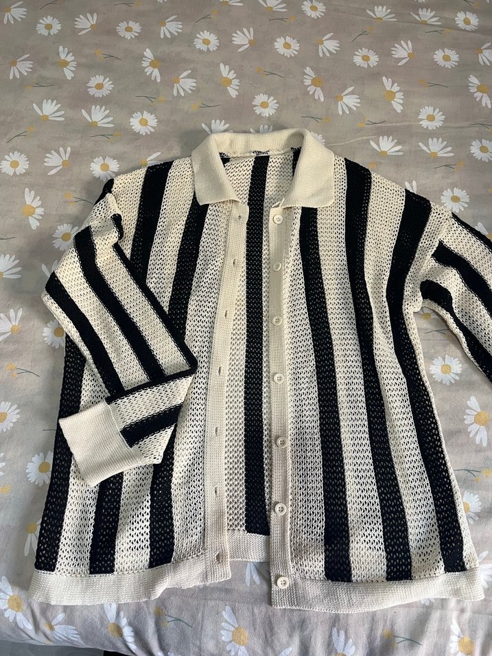 Uzun kollu, yakalı ve bol kesim örgü hırka, siyah ve beyaz çizgili desene sahiptir. Günlük kullanıma uygundur.