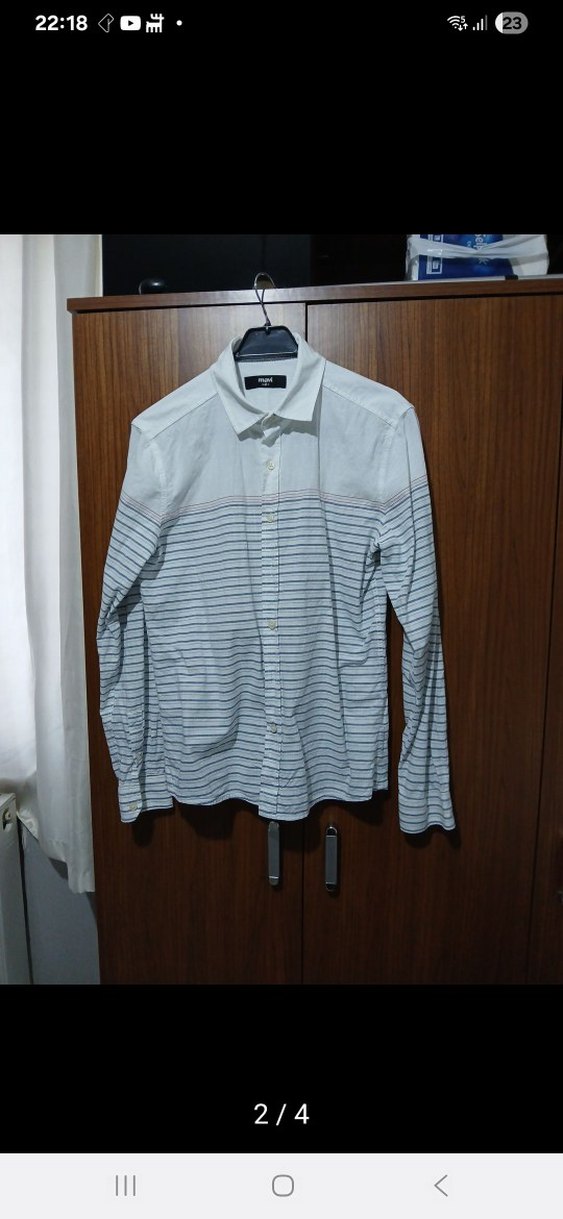 Pamuklu, uzun kollu ve düğmeli erkek gömlek. Beyaz zemin üzerine ince gri çizgilerle, normal kesim ve yakalı tasarım.