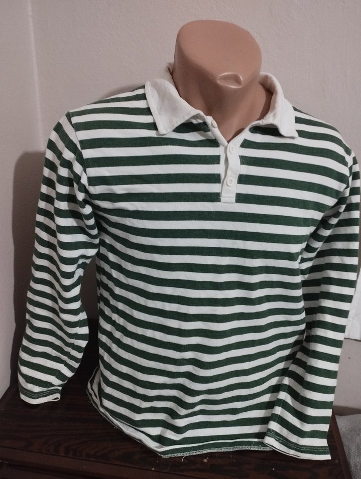Erkekler için uzun kollu, düğmeli yakalı polo tişört. Beyaz ve gri çizgili, bol kesim, sentetik kumaştan. Günlük sokak stili için uygun.