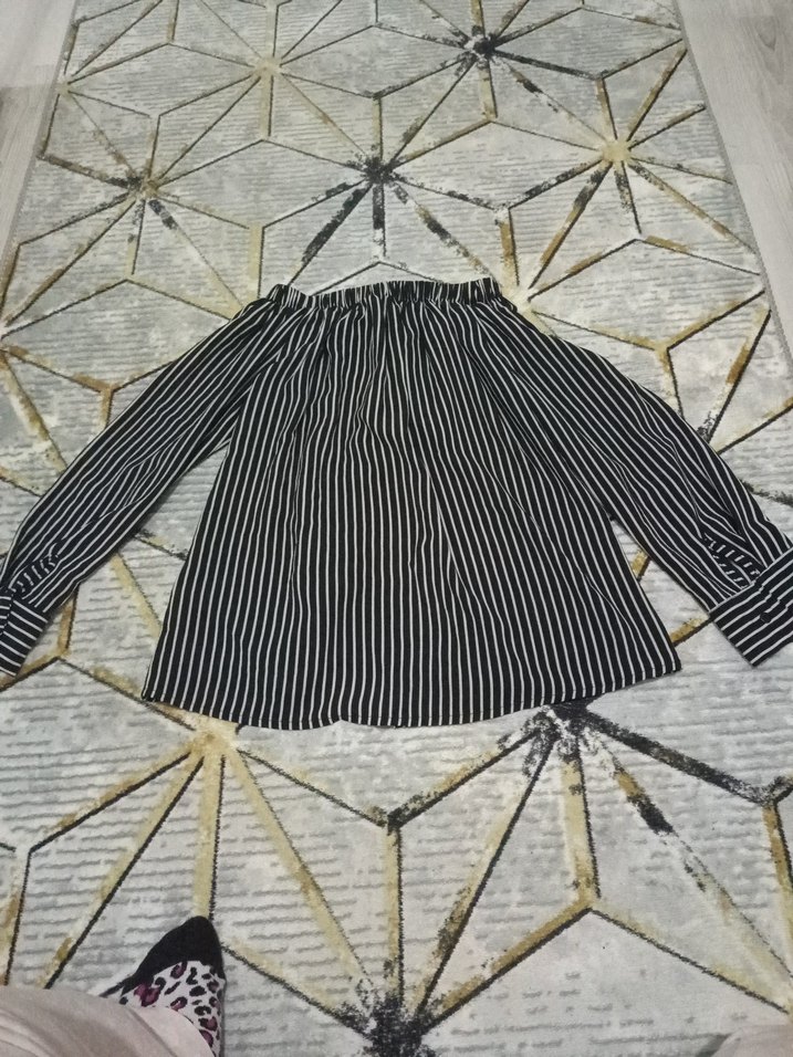 Uzun kollu, kayık yaka ve bol kesim siyah bluz. Pliseli, çizgili tasarıma sahip sentetik kumastan yapılmıştır.