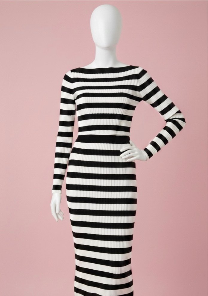 Uzun kollu, tekne yaka, siyah beyaz çizgili, vücuda oturan triko takım. Günlük sokak modasına uygun, Paris tarzı şıklık sunar. s bedendir ama esnek olduğu için m bedene de olur. eteği bilek hizasında yırtmaçsız kalem etektir. kazağın kol uçları yırtmaç detaylıdır, kayık yakalıdır. eteğin boyu 83 cm’dir. fotoğraflarda esnekliği görünüyor.