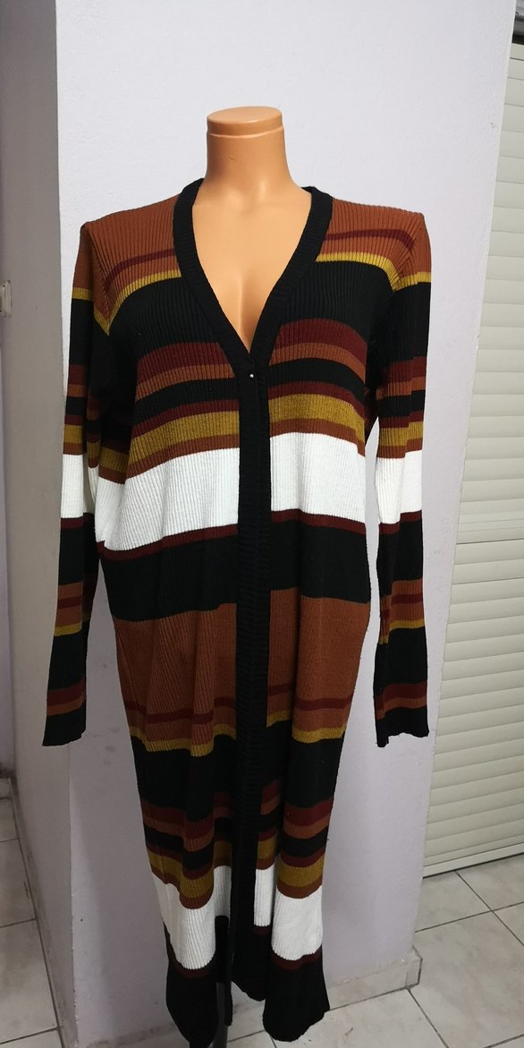 Uzun, bol kesim, V yakalı ve koyu kahverengi çizgili desenli triko hırka. Rahat ve çağdaş bohem tarzda, günlük kullanım için uygundur. Düğmesiz 42beden boyu 107cm iki kol arası 52 cm