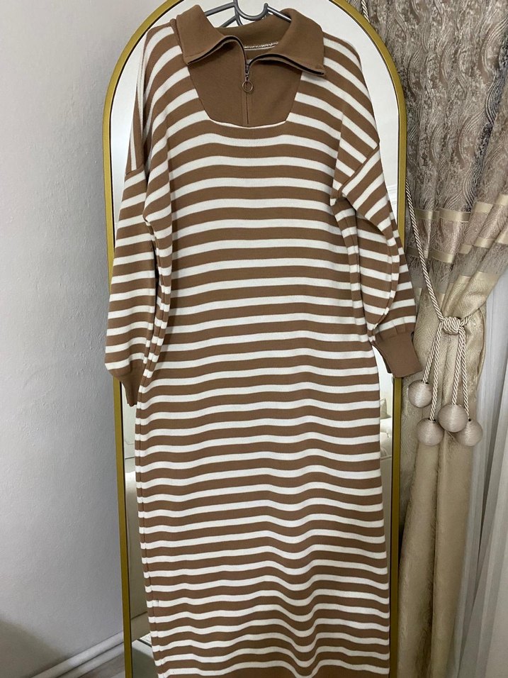 Uzun, bol kesim çizgili triko elbise, tekne yaka ve fermuarlı yakayla Paris sokak stilini rahatlıkla buluşturuyor.